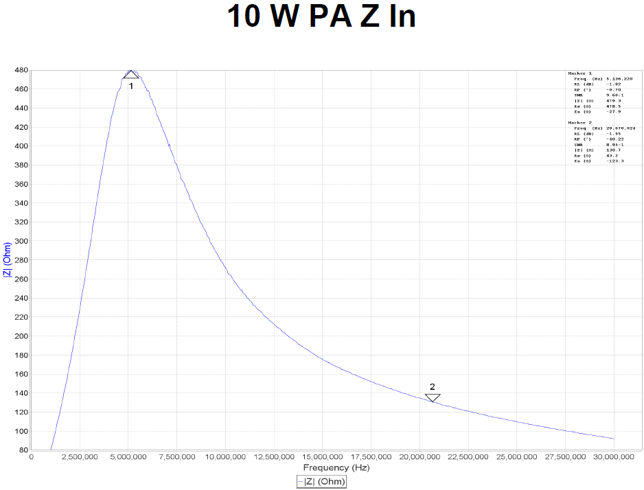 Fred's measurements show input impedance peaking at over 400-ohms in a quite narrow around 60m and 40m bands; dropping nearer to 50-ohms at the extremes (160m, 10m). Practically speaking the impedance variations will not usually be a problem for a 50-ohm pre-driver stage output. The SWR will be high but this is not likely to be of any importance at such low powers. If worried about this, just put a 75-ohm resistor in parallel with the 10W HF Linear PA input. That will reduce the amp gain by a few dB but give a flatter SWR, if you care.