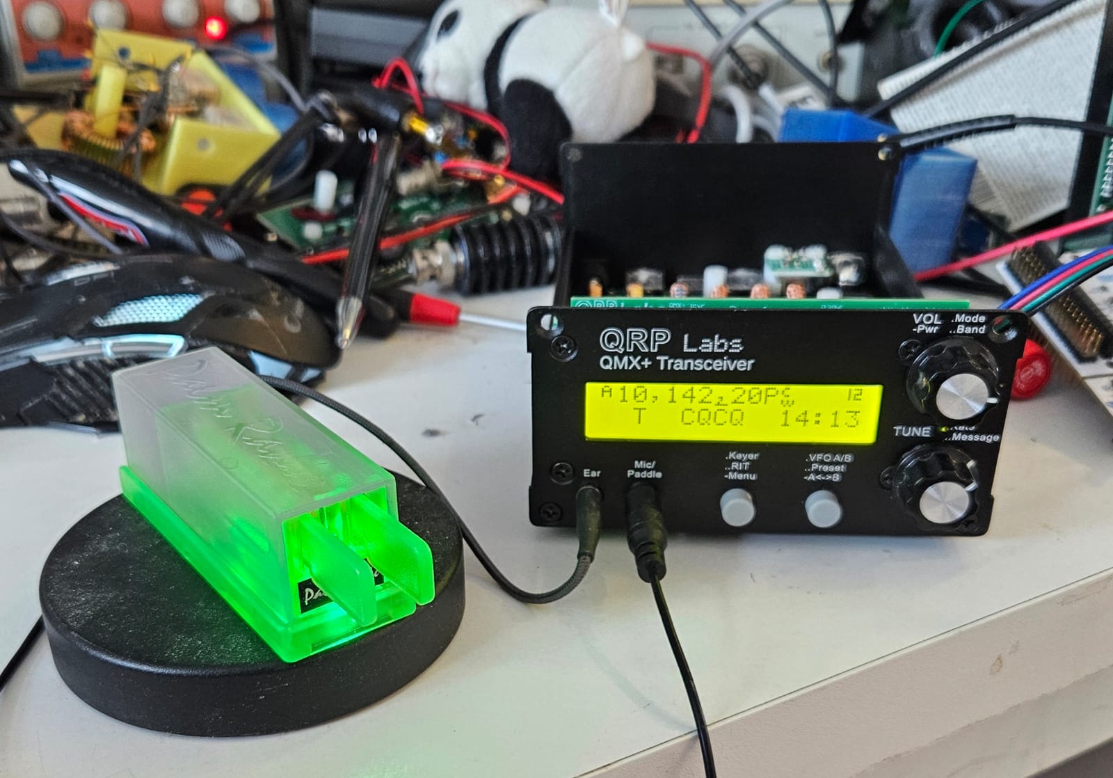 Fun with a QMX+ and a Palm Radio mini-paddle special edition (green). I modified the paddle to include two high brightness 3mm green LEDs in the very small recess in the base of the unit; and modified the QMX+ to supply current via the paddle connections.
