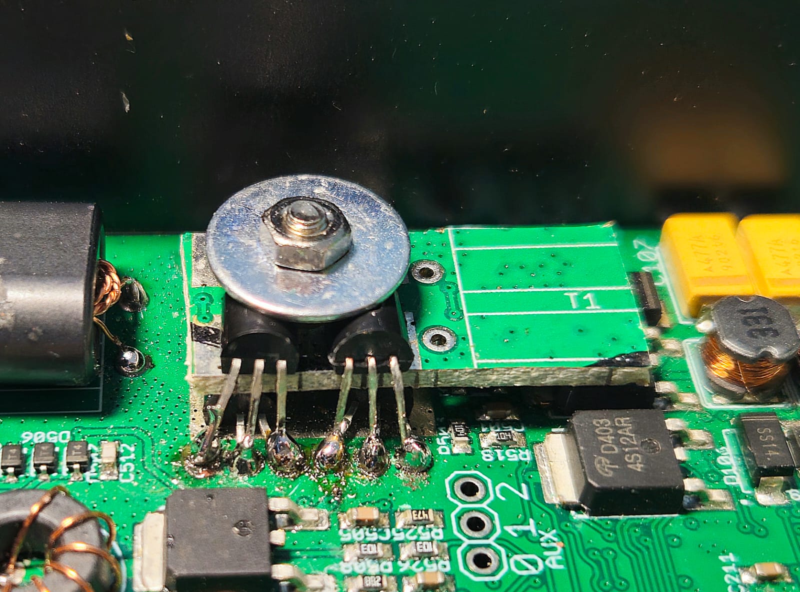 I soldered an extra set of BS170 transistors on top of the current set. Not being entirely brave enough to go without any heatsinking on the new transistors (as Roelof did), I bolted in an extra piece of old PCB to act as a heatsink (it is in fact, a piece of PCB chopped out of an unpopulated QMX board).